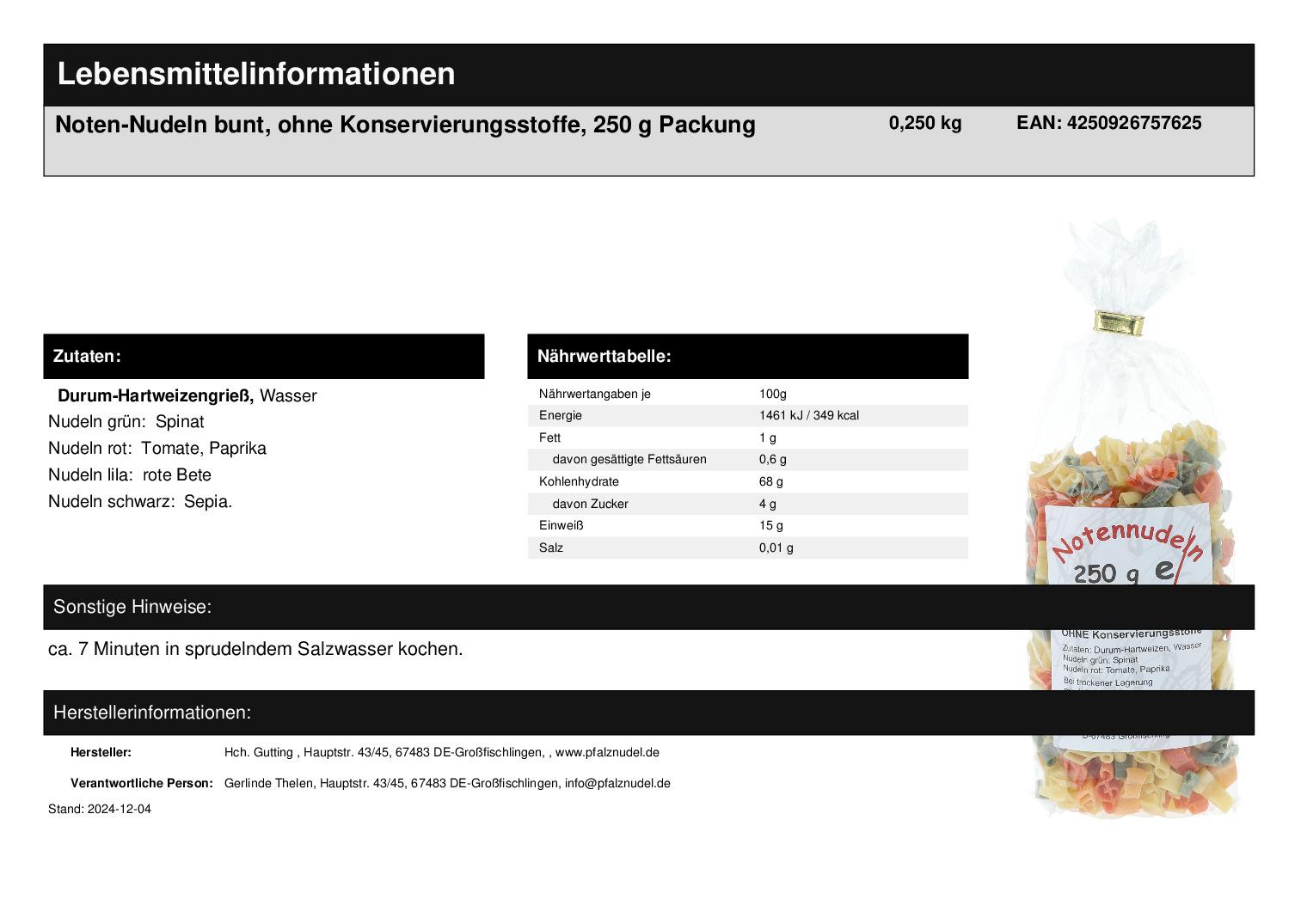 1 x Noten-Nudeln bunt, ohne Konservierungsstoffe, 250 g Packungmit verschiedenen Notenzeichen: Violinschlüssel, Pause, Doppel 16tel-Note