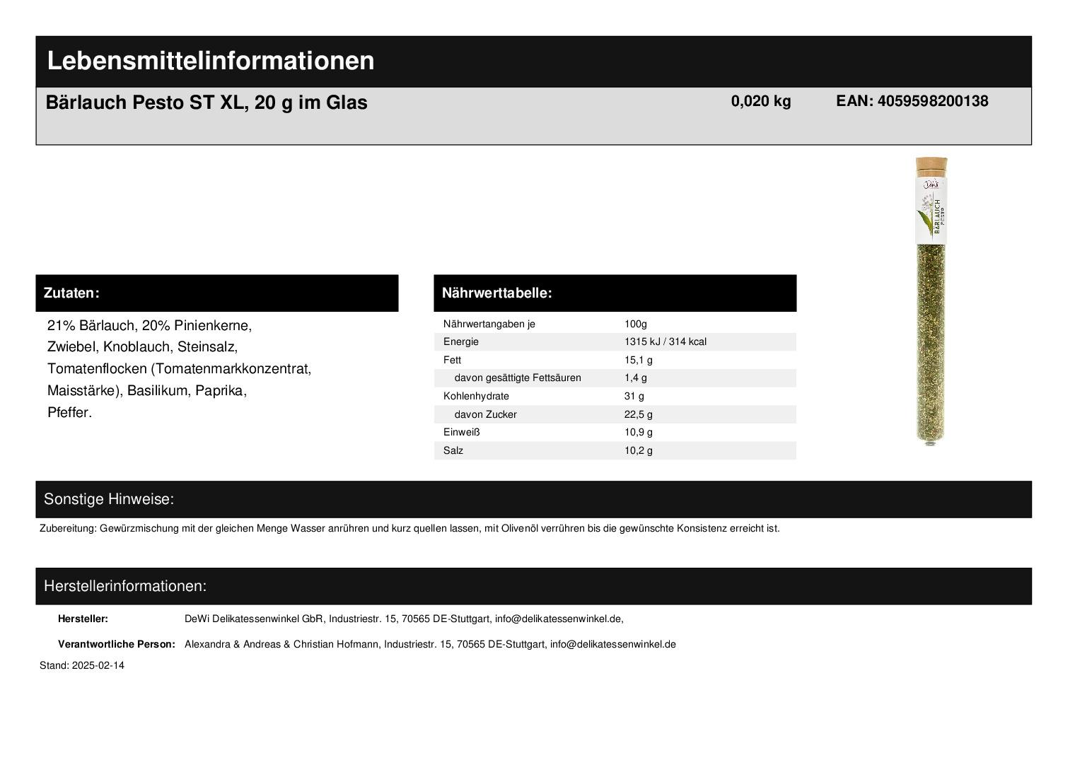 Zutaten: 21% Bärlauch, 20% Pinienkerne, Zwiebel, Knoblauch, Steinsalz, Tomatenflocken (Tomatenmarkkonzentrat, Maisstärke), Basilikum, Paprika, Pfeffer.