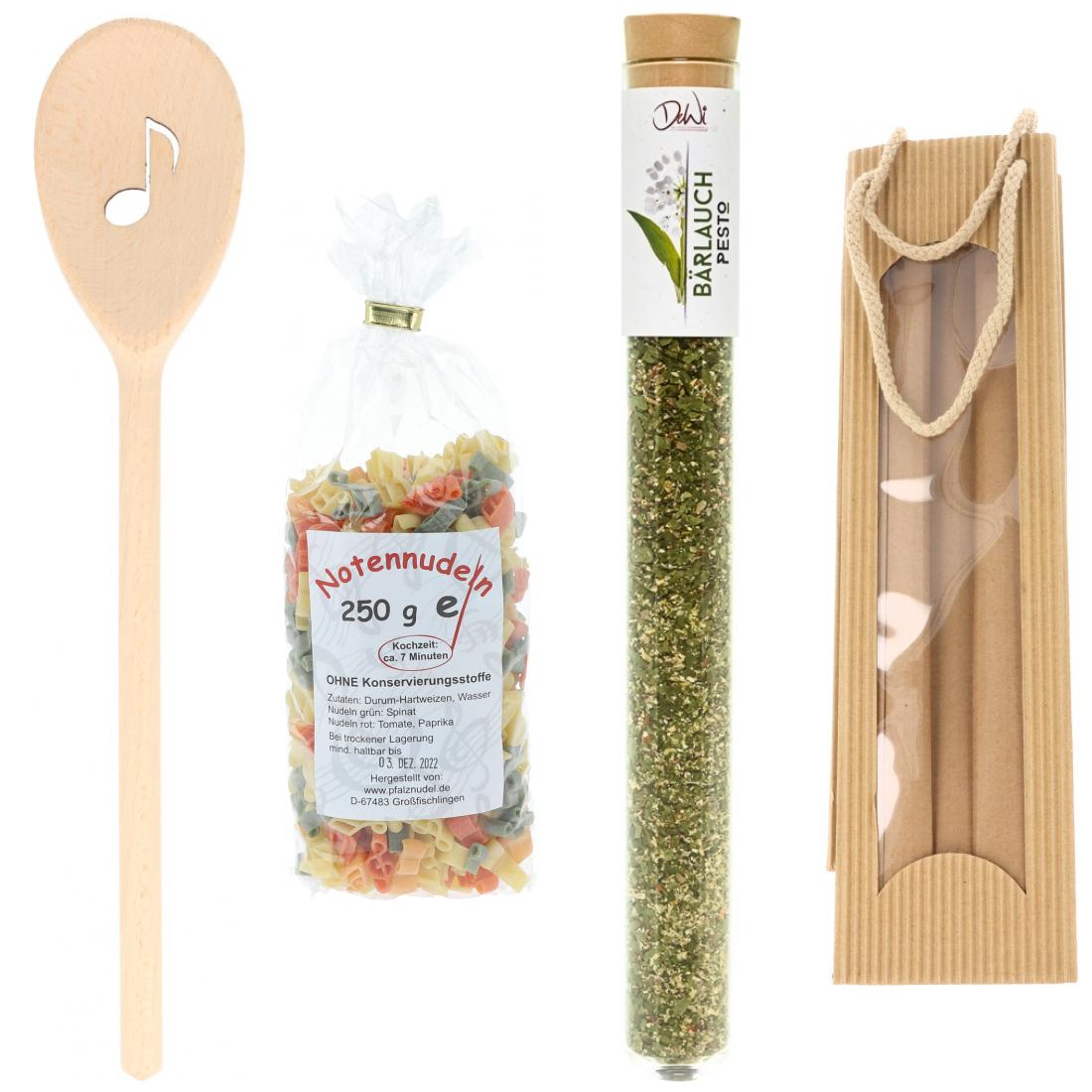 Geschenkset mit Kochlöffel, Notennudeln und Pesto - Motiv: Achtelnote