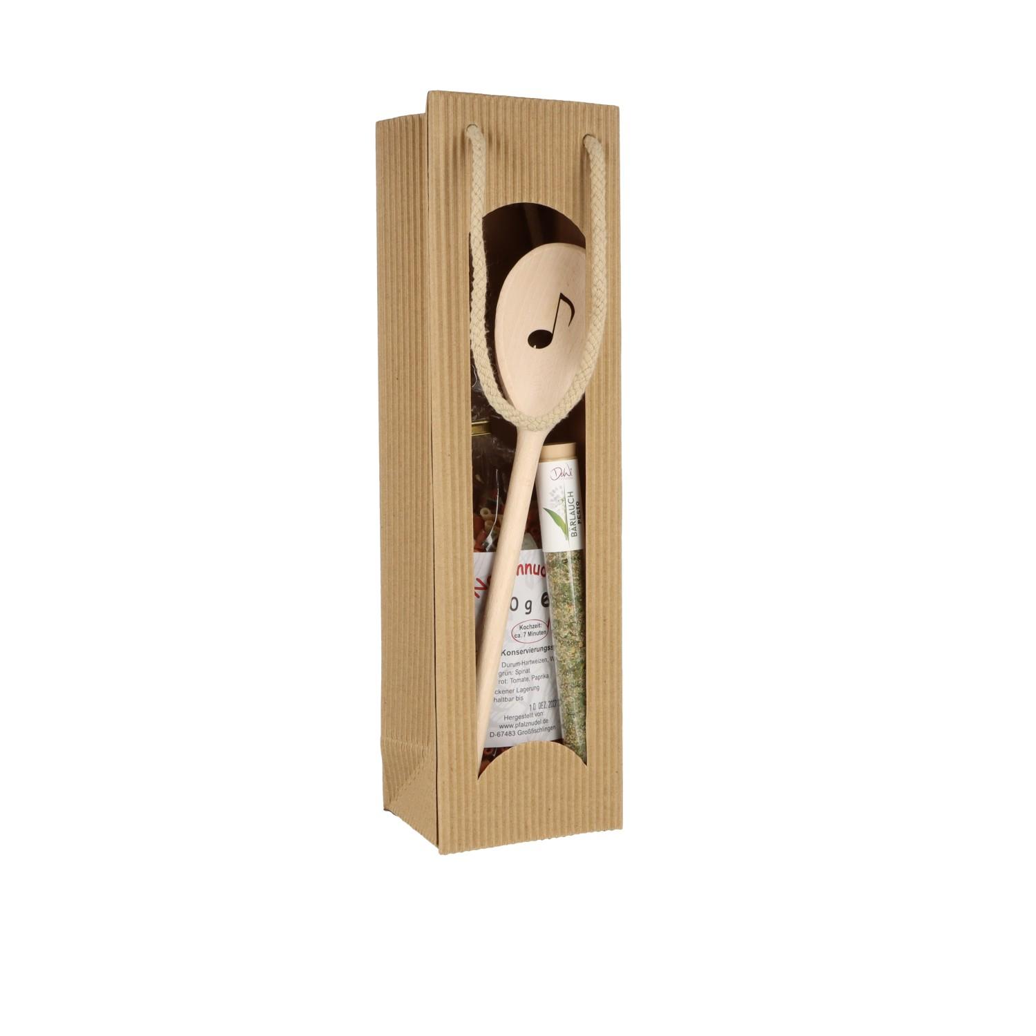 Geschenkset Kartontasche gewellt - mit Kochlöffel, Notennudeln und Bärlauch Pesto - Motiv: Achtelnote