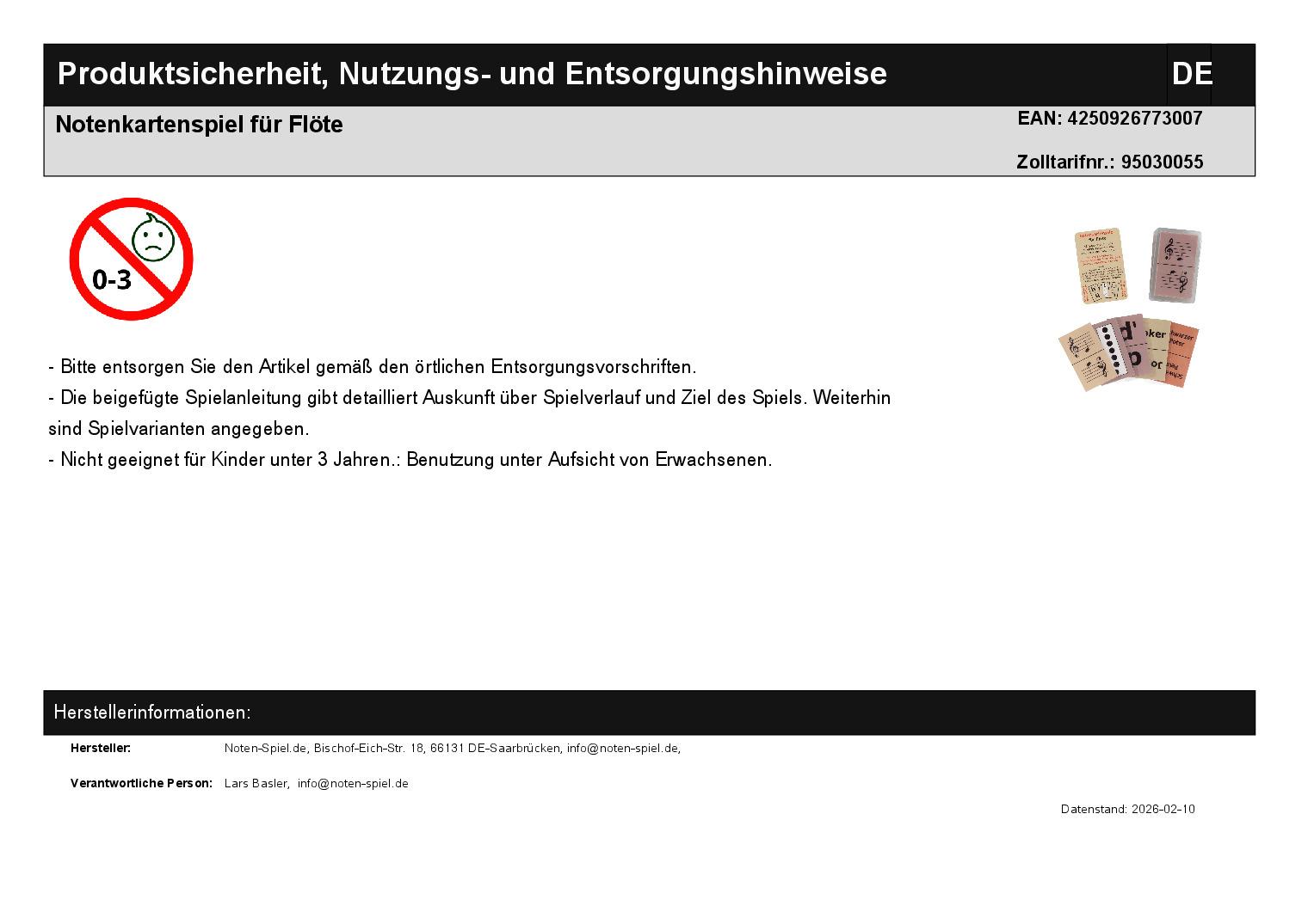 • 46 laminierte Spielkarten (54 x 86 mm): 14 Buchstabenkarten, 14 Notenkarten, 16 Griffbildkarten, 3 Jokerkarten, 1 Schwarze-Peter-Karte