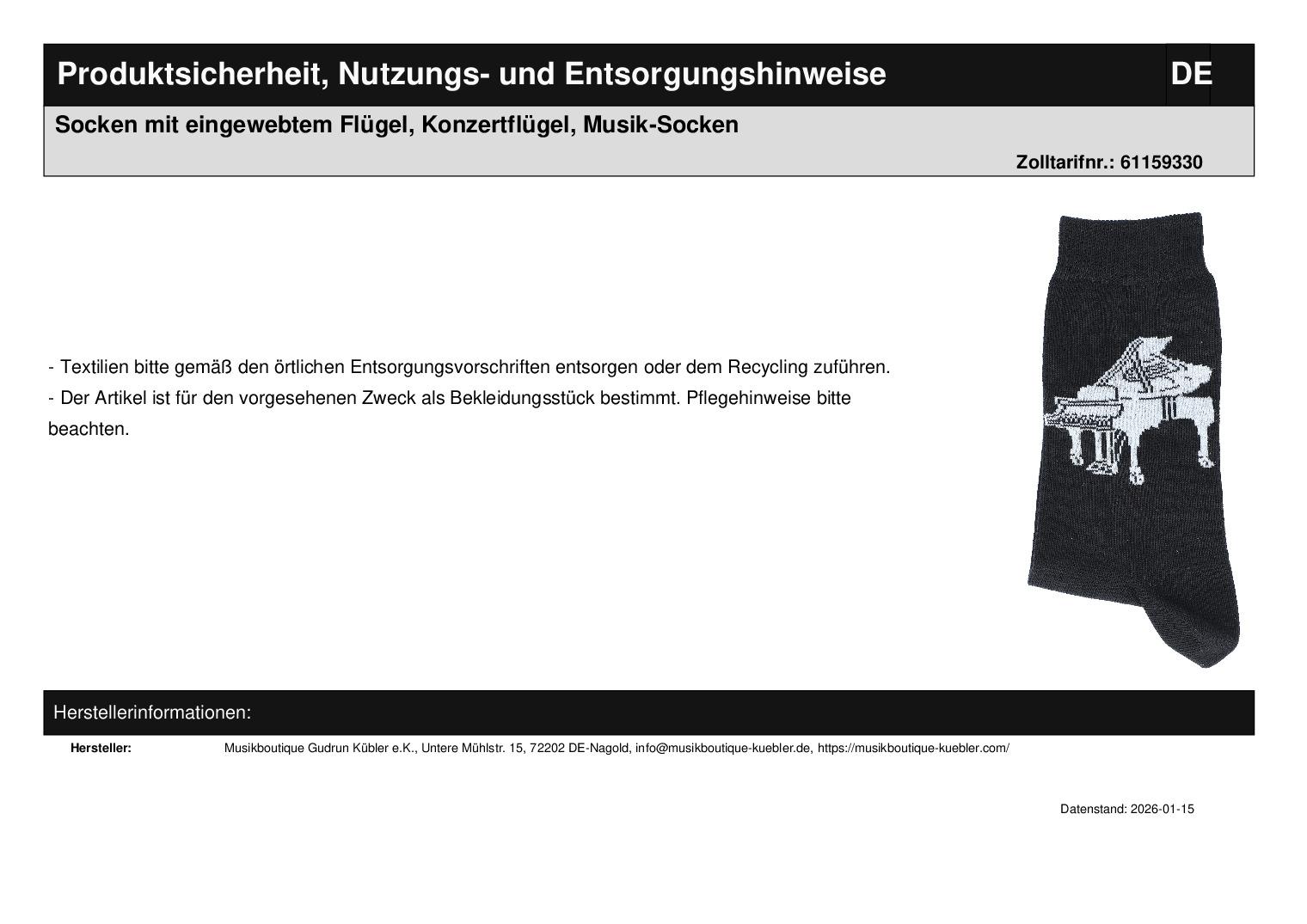 Mit unseren Musik-Socken setzen Sie ein musikalisches Statement. Ob für Musiker oder Musikliebhaber, ein besonderes Instrument oder ein allgemeines musikalisches Design, für sich oder als Geschenk, für Babys, Kinder und Erwachsene: bei unseren Socken werden Sie fündig. Die schwarzen Socken haben ein beidseitig eingewebtes Motiv. Egal ob kleiner oder großer Musiker, durch die Größenabstufung passen die individuellen Socken garantiert jedem Musikerfuß. Der hohe Baumwollanteil (70% Baumwolle, 25% Polyamid, 5% Elasthan) sorgt zudem für ein gutes Fußklima.