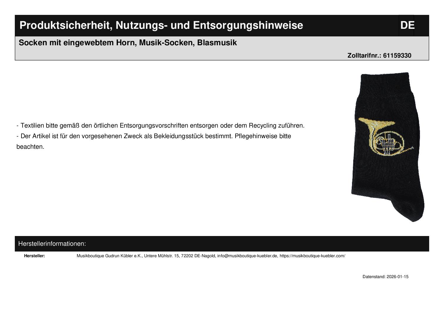 Mit unseren Musik-Socken setzen Sie ein musikalisches Statement. Ob für Musiker oder Musikliebhaber, ein besonderes Instrument oder ein allgemeines musikalisches Design, für sich oder als Geschenk, für Babys, Kinder und Erwachsene: bei unseren Socken werden Sie fündig. Die schwarzen Socken haben ein beidseitig eingewebtes Motiv. Egal ob kleiner oder großer Musiker, durch die Größenabstufung passen die individuellen Socken garantiert jedem Musikerfuß. Der hohe Baumwollanteil (70% Baumwolle, 25% Polyamid, 5% Elasthan) sorgt zudem für ein gutes Fußklima.